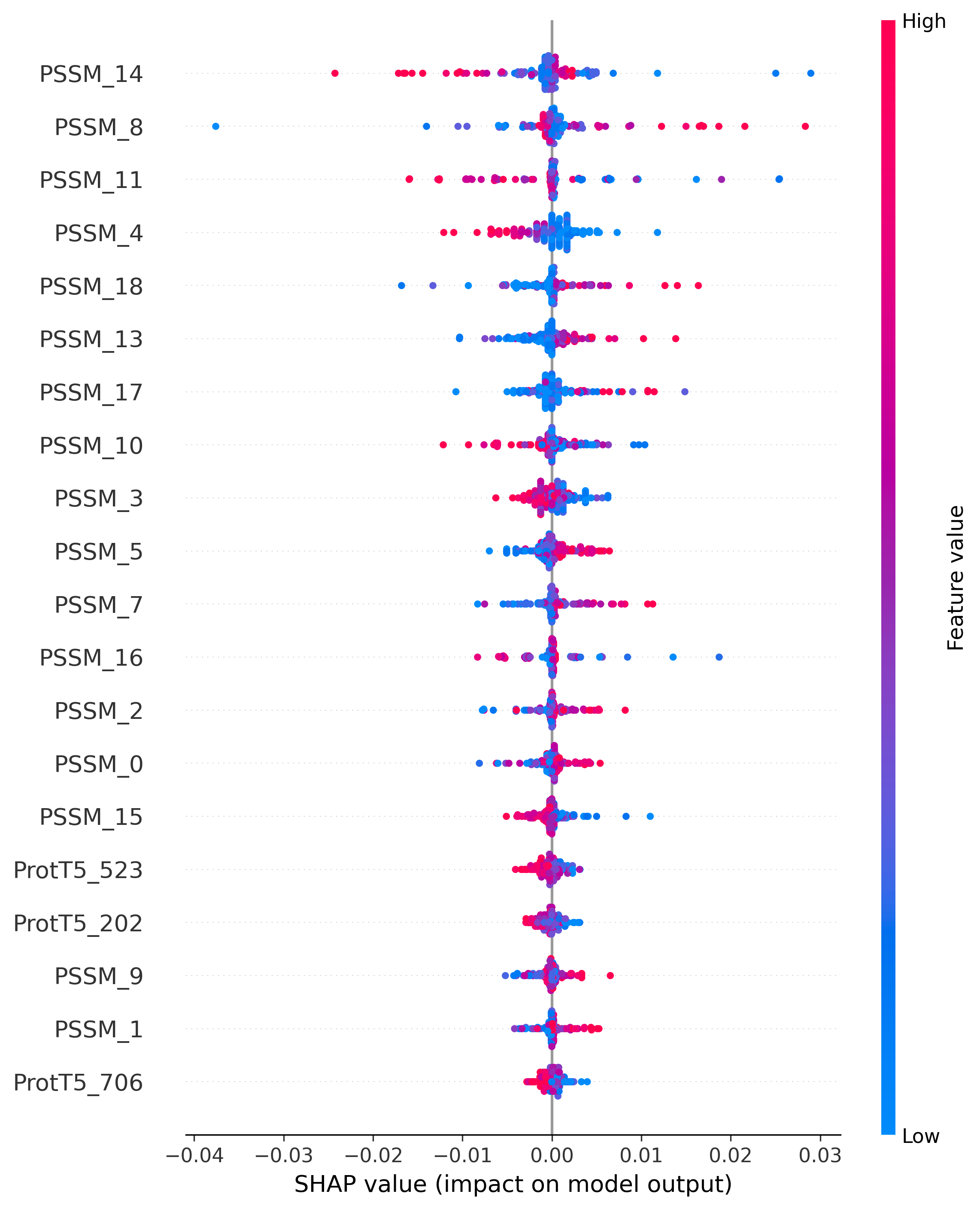 whereas on the protein side the main contributors are PSSM-derived evolutionary information and pretrained embeddings.
